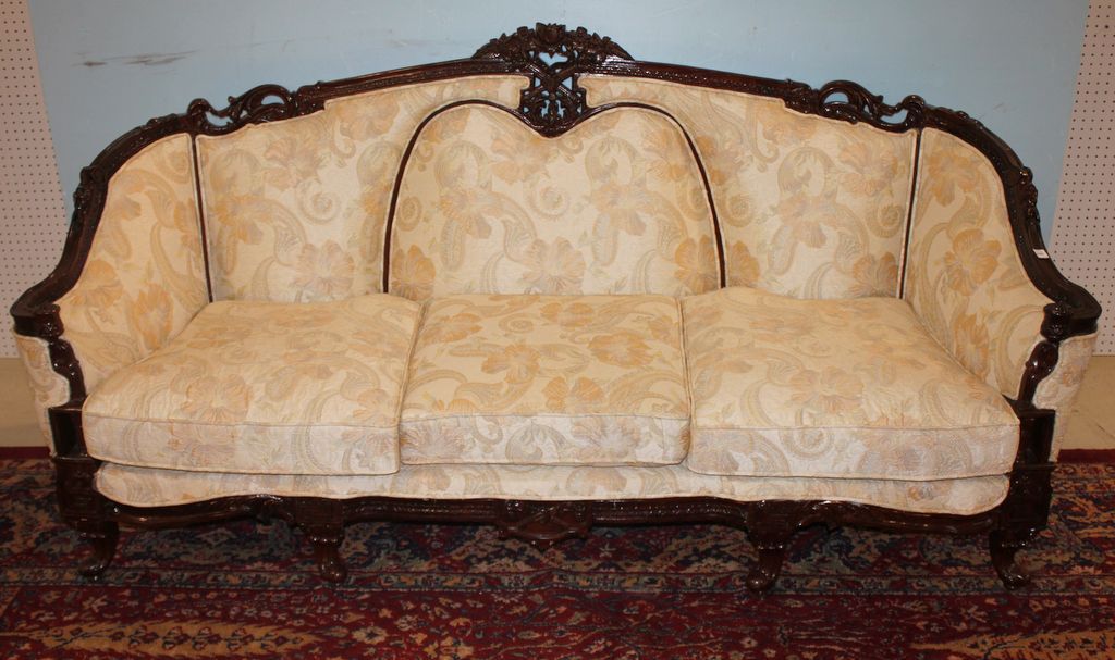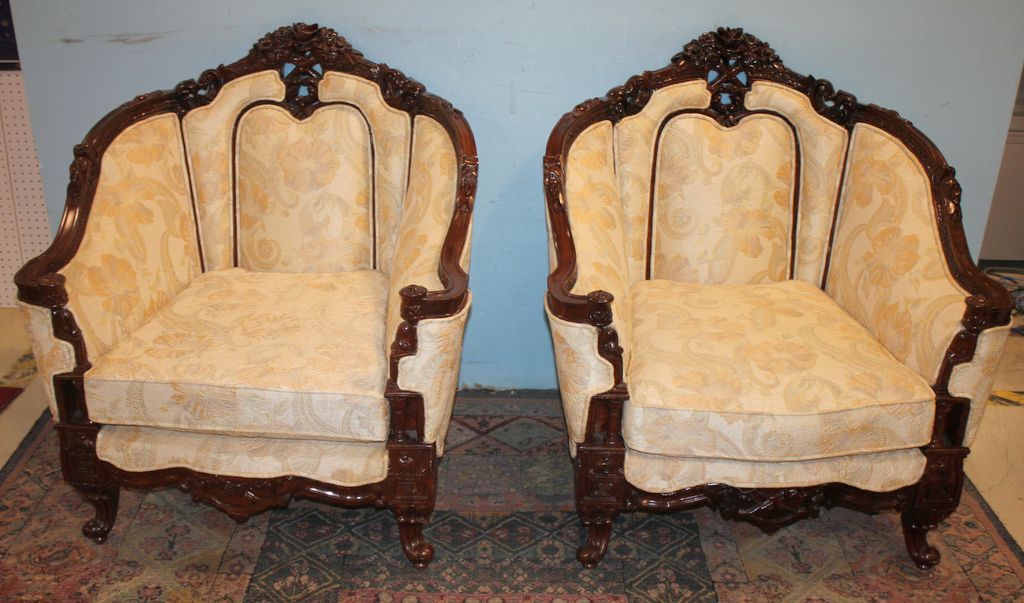 Three piece carved, three cushion sofa and pair of large barrel back chairs; sofa 84" w., 26" d., 40" h.; chairs 36" w. Three piece carved, three cushion sofa and pair of large barrel back chairs; sofa 84" w., 26" d., 40" h.; chairs 36" w.