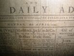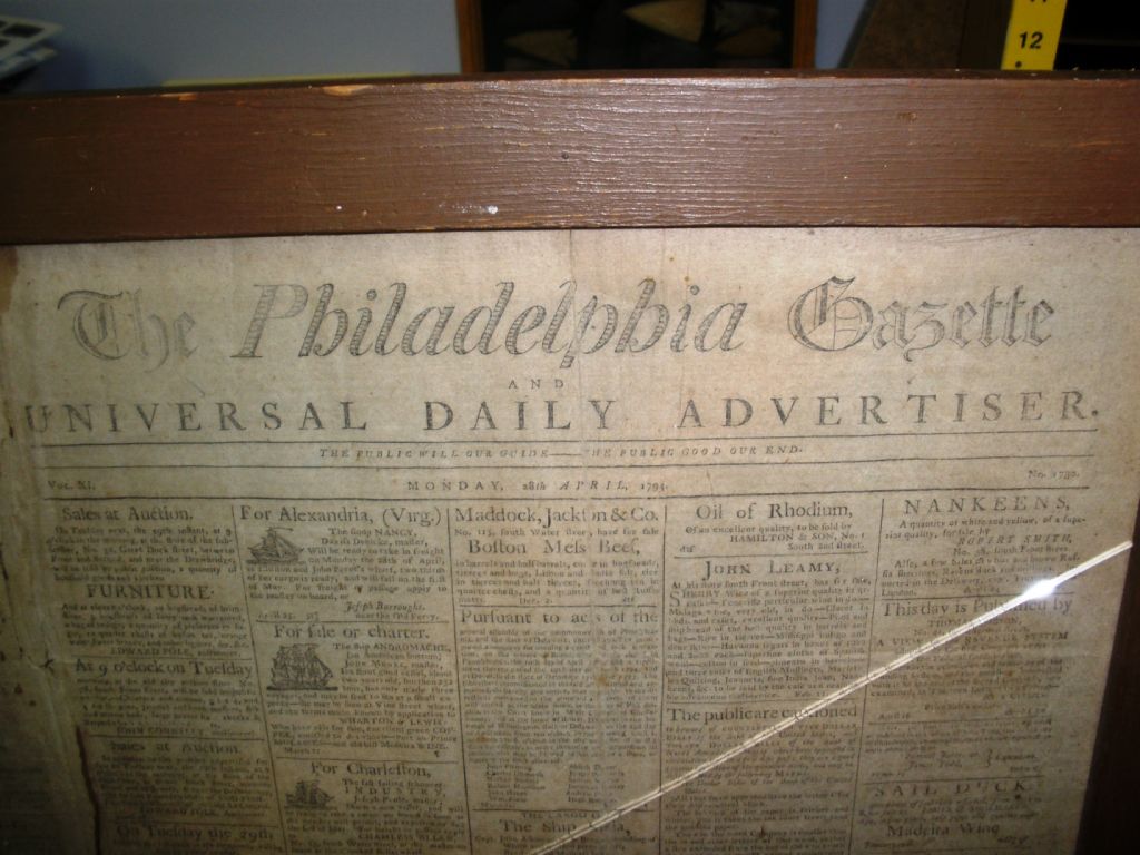 April 28, 1794 Newspaper "The Philadelphia Gazette and Daily Advertiser", framed and glass on each side. Appears to show the front and back page of the paper on one side and inside of front and inside of back of the paper on the other. -h. 23" x w. 27". April 28, 1794 Newspaper "The Philadelphia Gazette and Daily Advertiser", framed and glass on each side. Appears to show the front and back page of the paper on one side and inside of front and inside of back of the paper on the other. -h. 23" x w. 27".