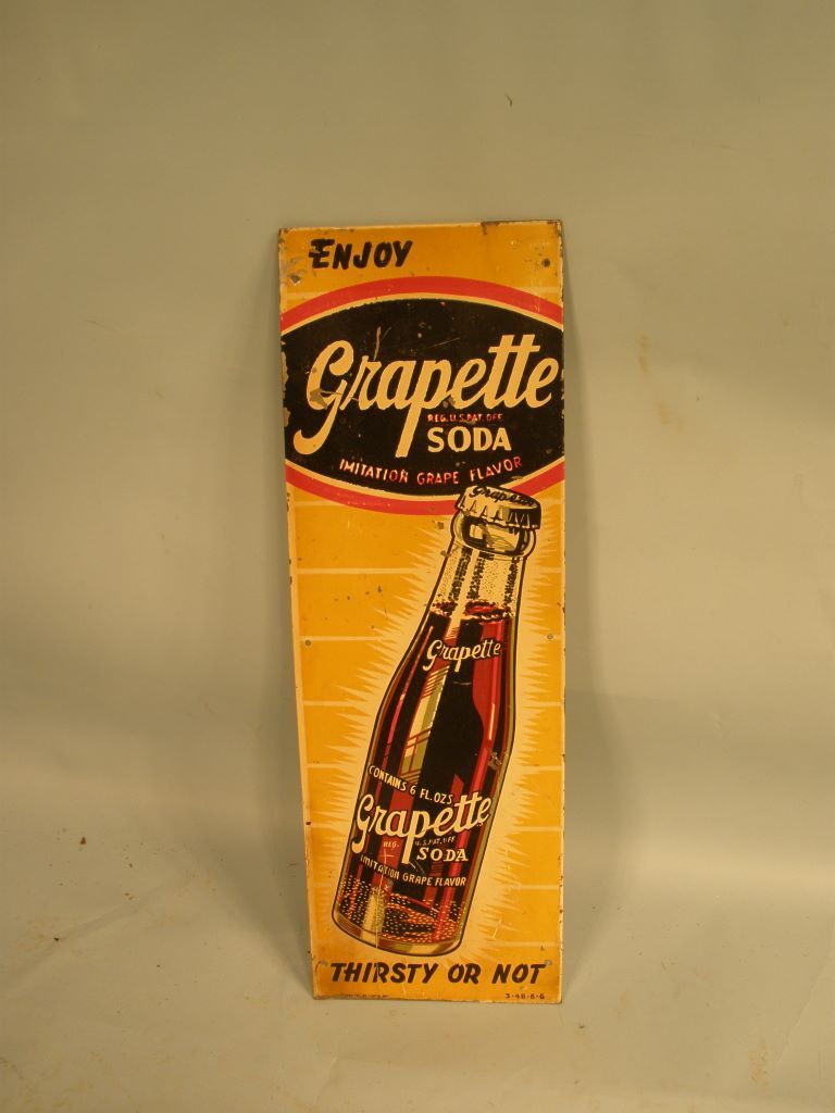 Great advertising sign for Grapette Soda. Grapette Soda was first produced in 1939. -h. 18" x w. 6 1/4". Condition Report: Good old sign. Some paint wear in places. Great advertising sign for Grapette Soda. Grapette Soda was first produced in 1939. -h. 18" x w. 6 1/4". Condition Report: Good old sign. Some paint wear in places.