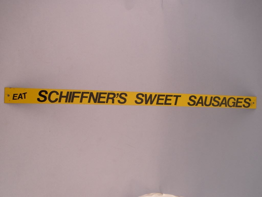 Thin metal advertising plate promoting "Eat Schiffner's Sweet Sausages" Bold black print on yellow background. - h. 1" x w. 18 1/2". Thin metal advertising plate promoting "Eat Schiffner's Sweet Sausages" Bold black print on yellow background. - h. 1" x w. 18 1/2".