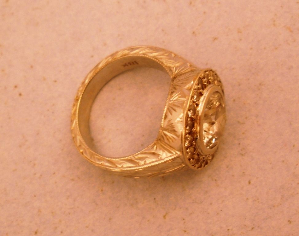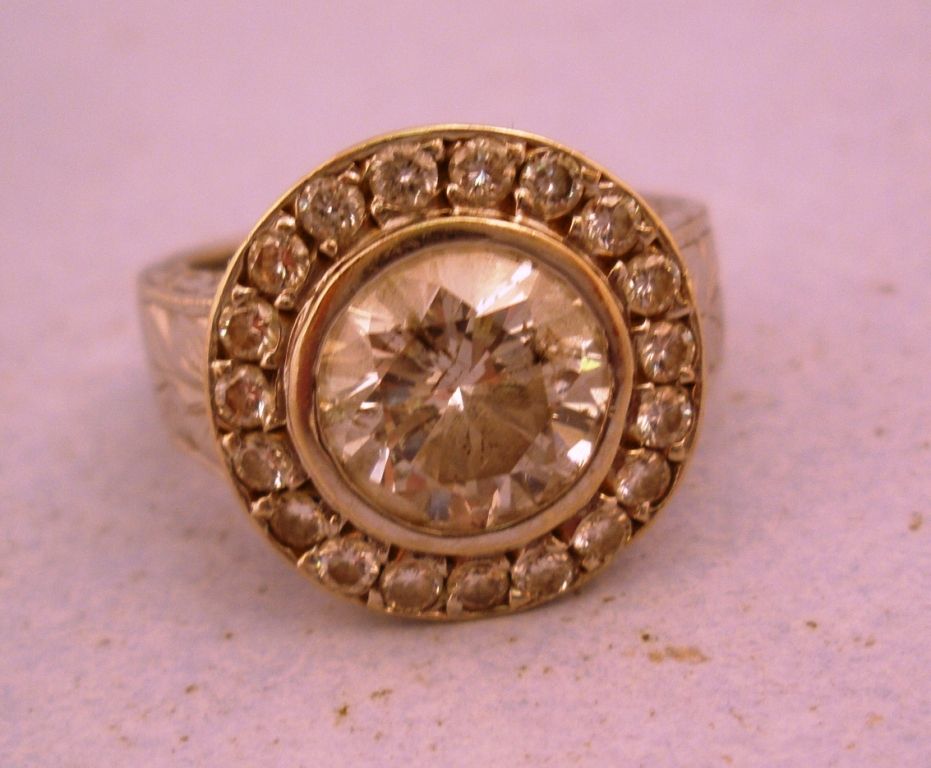 Lady's fancy Diamond ring contains brilliant cut center stone measuring approximately 2.25 ct., surrounded by nineteen brilliant cut diamonds with a total weight of .57 ct. The mounting is 18 ct. white gold. Color: H / Clarity i2. Total diamond weight is 2.82 ct. Lady's fancy Diamond ring contains brilliant cut center stone measuring approximately 2.25 ct., surrounded by nineteen brilliant cut diamonds with a total weight of .57 ct. The mounting is 18 ct. white gold. Color: H / Clarity i2. Total diamond weight is 2.82 ct.