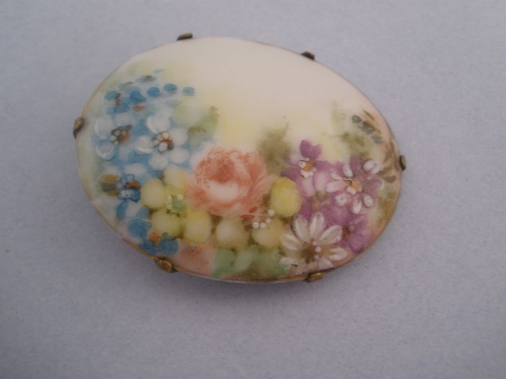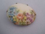 Pretty broach with hand panted floral design insert. -h. 1 1/2" x w. 1 3/4" Pretty broach with hand panted floral design insert. -h. 1 1/2" x w. 1 3/4"