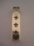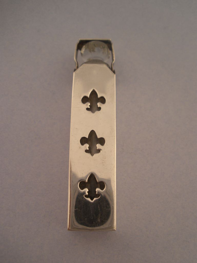 Small cut glass Perfume Cache in Sterling case with 3 fleur de le symbols on each side, h. 2 1/2" x w. 1/2" Small cut glass Perfume Cache in Sterling case with 3 fleur de le symbols on each side, h. 2 1/2" x w. 1/2"
