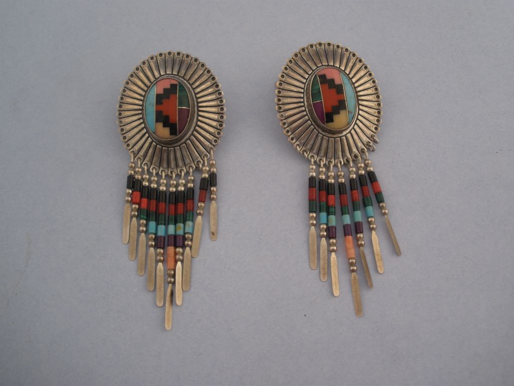 Pair of southwestern style Sterling Concho base earrings with delicate jeweled prisms. -h. 3" x w. 1 1/3" Pair of southwestern style Sterling Concho base earrings with delicate jeweled prisms. -h. 3" x w. 1 1/3"