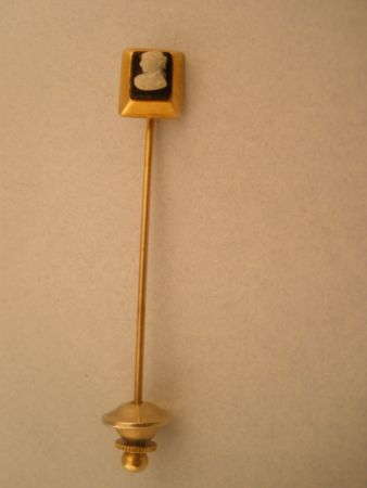 Gold Stick Pen with small Cameo Top. Black background with raised White Cameo, 14 K., L. 2 1/3". Gold Stick Pen with small Cameo Top. Black background with raised White Cameo, 14 K., L. 2 1/3".