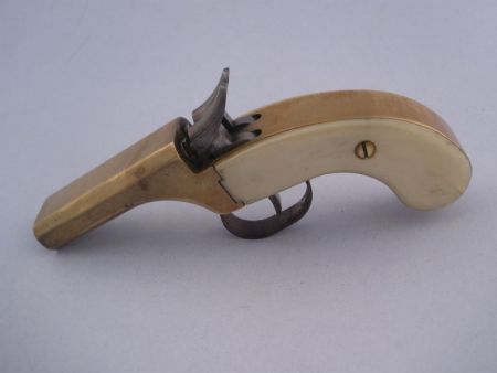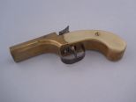 Nice old double barrel pistol derringer muzzle load 1840. Brass with Ivory Handle. 2 1/2" x 7" Nice old double barrel pistol derringer muzzle load 1840. Brass with Ivory Handle. 2 1/2" x 7"