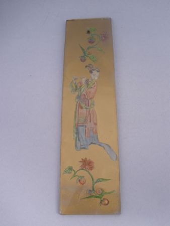 Rectangular shape Oriental glass wall plate with gold painted background and Geisha Girl playing musical instrument. In original box marked Coplon's South Park. Box 4" x 13" Plaque 12"T 5"W. Rectangular shape Oriental glass wall plate with gold painted background and Geisha Girl playing musical instrument. In original box marked Coplon's South Park. Box 4" x 13" Plaque 12"T 5"W.