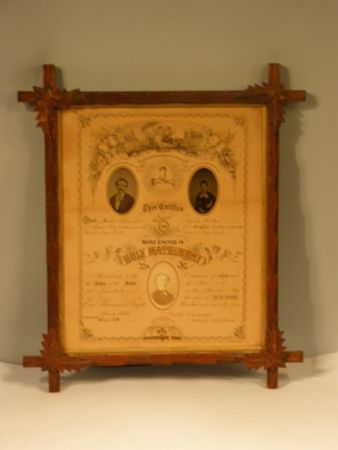 Old framed marriage certificate from 1875. Certificate includes picture of the bride, groom and minister. Wonderful condition. 22" T 19" W Old framed marriage certificate from 1875. Certificate includes picture of the bride, groom and minister. Wonderful condition. 22" T 19" W