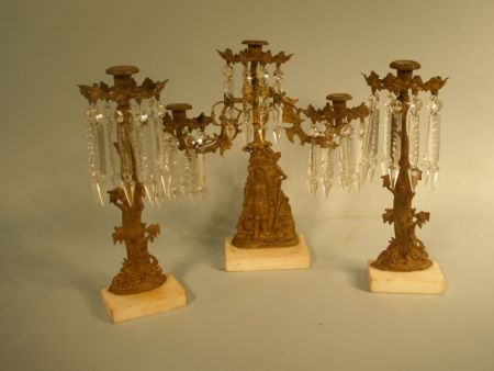 Early Three-Piece American Gilt-Brass and Gray/White Marble Garniture, second quarter 19th century, comprised of a three-light center girandole and a pair of flanking single-light girandoles, dressed throughout with period prisms. - h. 16" Early Three-Piece American Gilt-Brass and Gray/White Marble Garniture, second quarter 19th century, comprised of a three-light center girandole and a pair of flanking single-light girandoles, dressed throughout with period prisms. - h. 16"