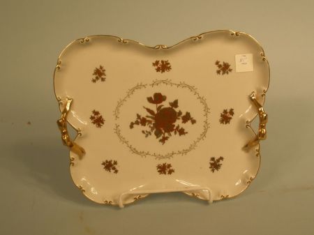 Lovely white Bow-Shaped dresser tray with gold-leaf handle and gold-leaf rose design. - h. 12 1/4" x 9 3/4" Lovely white Bow-Shaped dresser tray with gold-leaf handle and gold-leaf rose design. - h. 12 1/4" x 9 3/4"