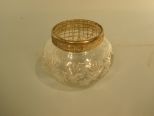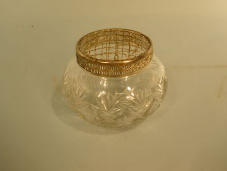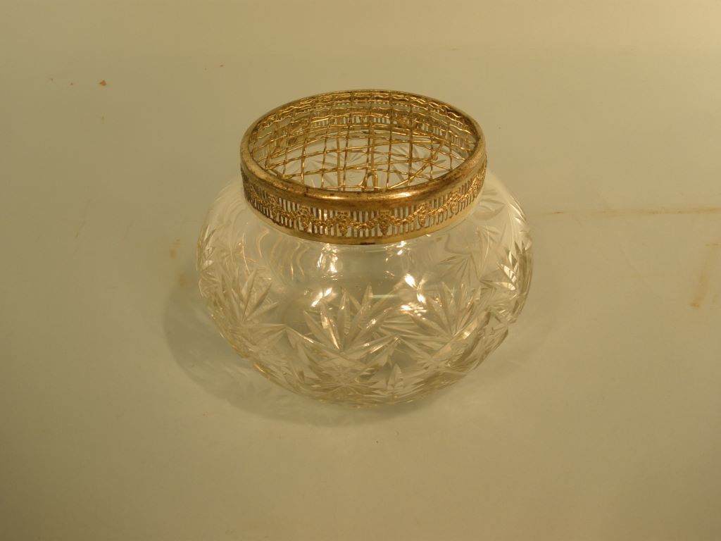 Pretty Cut Glass Rose Bowl with Silver Plate Flower Frog top. - h. 5" dia. 7" Pretty Cut Glass Rose Bowl with Silver Plate Flower Frog top. - h. 5" dia. 7"