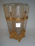 Delicate frost cut to clear glass vase in gold lace-pattern footed stand. - h. 8 1/2" x w. 6" Delicate frost cut to clear glass vase in gold lace-pattern footed stand. - h. 8 1/2" x w. 6"