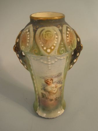 Small double-handled Royal Portrait Vase. Earthy blue and green color pattern. H. 7" x w. 4" Small double-handled Royal Portrait Vase. Earthy blue and green color pattern. H. 7" x w. 4"