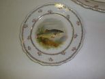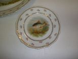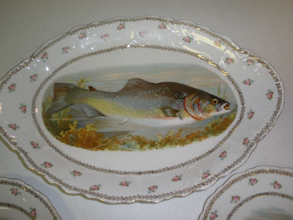 Very pretty Austrian Fish Set with gold trim and tiny pink roses on white background. Set includes platter and two plates. Marked Royal on back. Platter is 17.5" wide. Plates are 9" round. Very pretty Austrian Fish Set with gold trim and tiny pink roses on white background. Set includes platter and two plates. Marked Royal on back. Platter is 17.5" wide. Plates are 9" round.