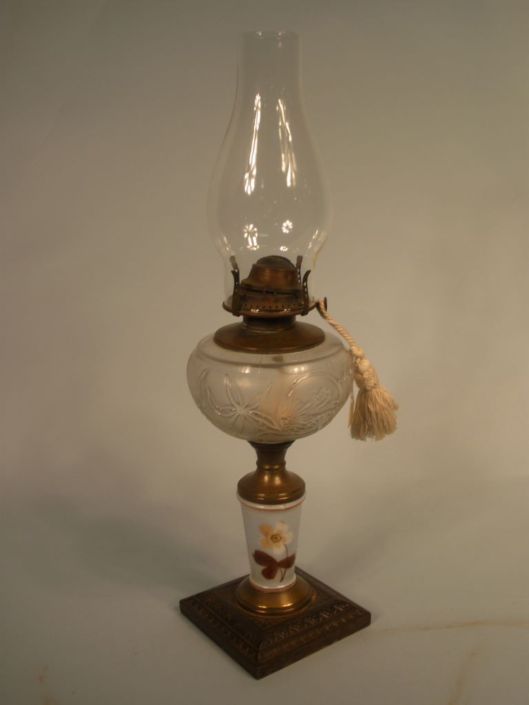 Very fine Brass based oil lamp, with hand painted flowers on base and pressed glass kerosene holder, with shade. -h. 21" Very fine Brass based oil lamp, with hand painted flowers on base and pressed glass kerosene holder, with shade. -h. 21"