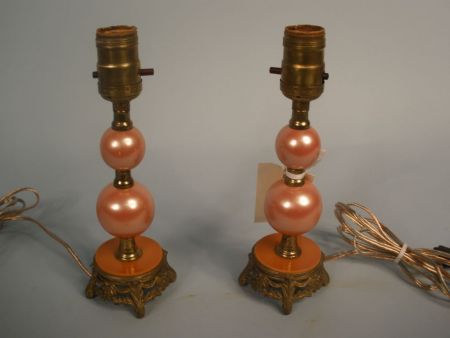 Petite pair of lamps with double ball design in pink tone on footed metal base. H. 9" x w. 6" Petite pair of lamps with double ball design in pink tone on footed metal base. H. 9" x w. 6"