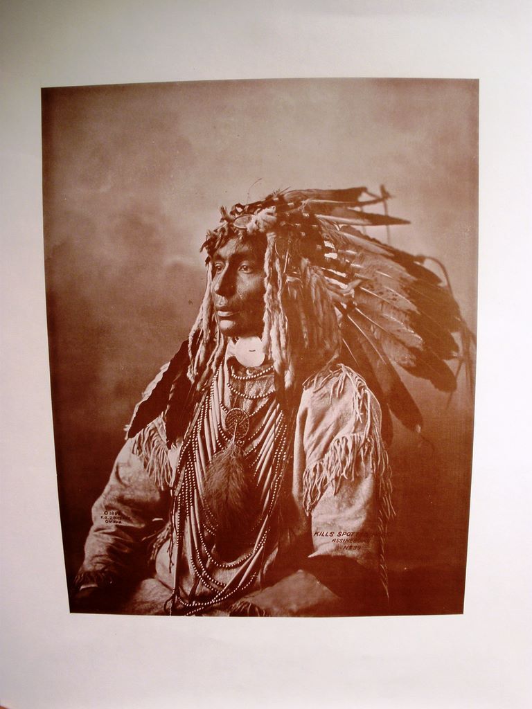 Kills Spotted Horse F.A. RINEHART Print, from No. 39, 1898, photo. Kills Spotted Horse belonged to the ASSINIBOINE tribe, who also call themselves "Nakota," meaning "The Generous Ones," are of Yanktonai Sioux ancestry. The tribe migrated to Montana and Canada in the 1700's and 1800's. Established in 1869, the Fort Belknap Reservation located in north central Montana about 36 miles from the Canadian border, and as of 2004, there are 2,697 ASSINIBOINE tribal members enrolled there. H. 25" w. 19" Kills Spotted Horse F.A. RINEHART Print, from No. 39, 1898, photo. Kills Spotted Horse belonged to the ASSINIBOINE tribe, who also call themselves "Nakota," meaning "The Generous Ones," are of Yanktonai Sioux ancestry. The tribe migrated to Montana and Canada in the 1700's and 1800's. Established in 1869, the Fort Belknap Reservation located in north central Montana about 36 miles from the Canadian border, and as of 2004, there are 2,697 ASSINIBOINE tribal members enrolled there. H. 25" w. 19"