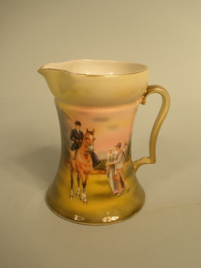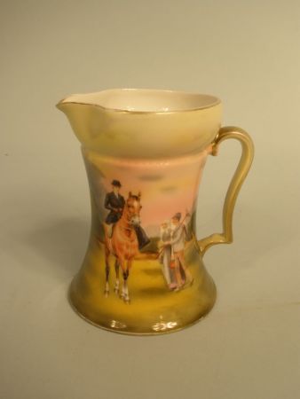 Small Royal Bayreuth Pitcher with hand painted Equestrian Scene on front. H. 4 1/2" x dia. 3 1/2" Small Royal Bayreuth Pitcher with hand painted Equestrian Scene on front. H. 4 1/2" x dia. 3 1/2"