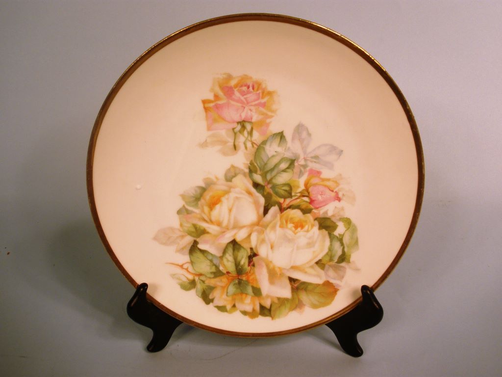 Nice hand painted German plate. Pretty floral platter with gold leaf band around plate's edge. Marked with 3 crowns on back. Dia. 8 1/2" Nice hand painted German plate. Pretty floral platter with gold leaf band around plate's edge. Marked with 3 crowns on back. Dia. 8 1/2"