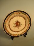 Hand painted decorative plate with floral design and what appears to be a crest in center. Marked WL 1897 on back. Labeled not for food. Dia. 10 1/2" Hand painted decorative plate with floral design and what appears to be a crest in center. Marked WL 1897 on back. Labeled not for food. Dia. 10 1/2"