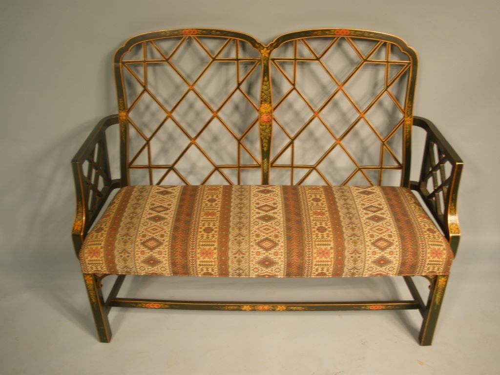Nice hand painted wooden settee with upholstered seat. Wood frame is painted a deep green with floral design. H. 37 1/2" x w. 48" Nice hand painted wooden settee with upholstered seat. Wood frame is painted a deep green with floral design. H. 37 1/2" x w. 48"