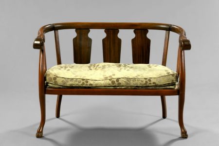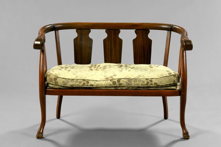American Late Victorian Stained Mahogany Settee, ca. 1900, the back of curved form and supported by shaped splats, the arms ending in rolled knuckles, with a cushioned seat, raised on legs ending in paw feet, h. 32-3/4", w. 44", d. 22". American Late Victorian Stained Mahogany Settee, ca. 1900, the back of curved form and supported by shaped splats, the arms ending in rolled knuckles, with a cushioned seat, raised on legs ending in paw feet, h. 32-3/4", w. 44", d. 22".