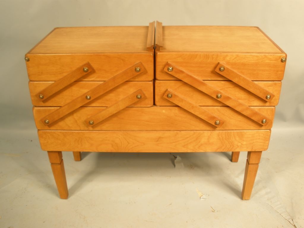 Nice Double Sewing Cabinet on legs. Both sides fold to expose 2 drawers with a larger drawer at bottom. 21" tall, 27" wide. Nice Double Sewing Cabinet on legs. Both sides fold to expose 2 drawers with a larger drawer at bottom. 21" tall, 27" wide.