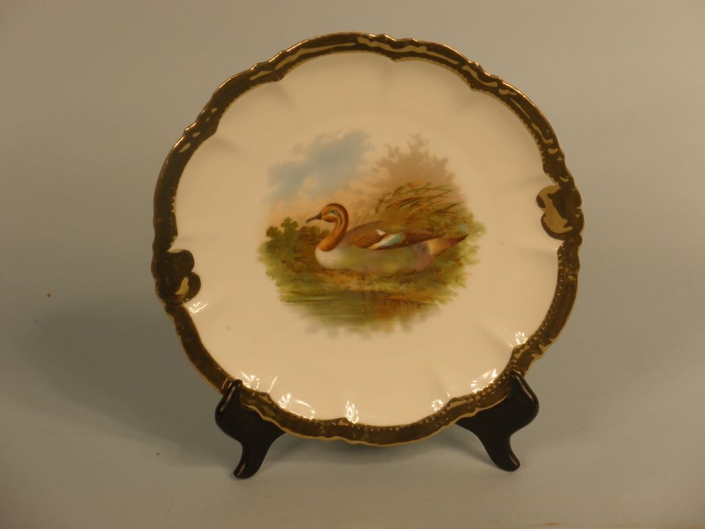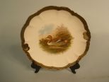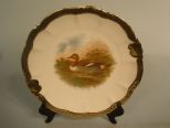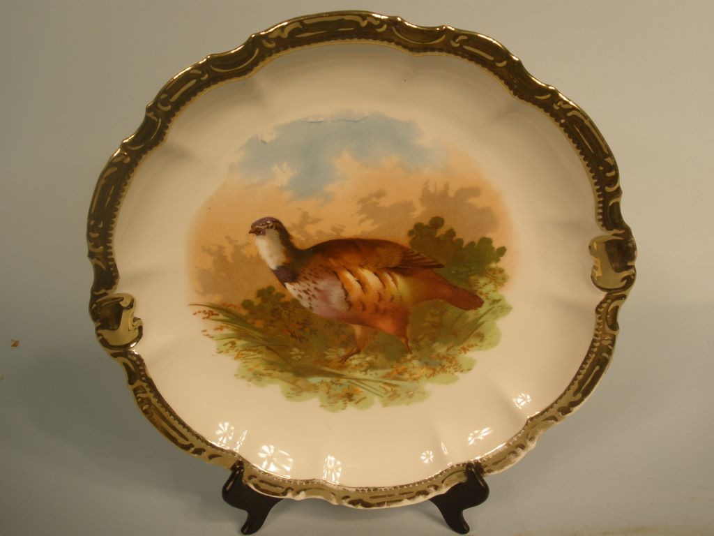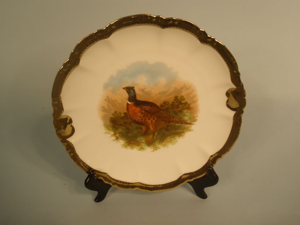 Very nice Bavarian Game Set with Platter and 6 plates. White background with gold leaf scalloped edges. Marked with a crown and PM. Platter is 12 1/2"dia. Plates 9" dia. Normal wear of gold leaf. Very nice Bavarian Game Set with Platter and 6 plates. White background with gold leaf scalloped edges. Marked with a crown and PM. Platter is 12 1/2"dia. Plates 9" dia. Normal wear of gold leaf.