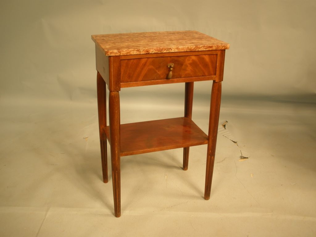 French Marble Top end Table, one drawer and shelf at bottom -h. 30" x w. 20" d. 13 3/4" French Marble Top end Table, one drawer and shelf at bottom -h. 30" x w. 20" d. 13 3/4"