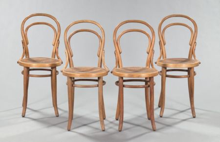 Suite of Four "Thonet"-Signed Bentwood Chairs, ca. 1900, each with a round bentwood back and concentric inset round seat, curved hip rest and cabriole legs joined by a single circular stretcher, h. 34", w. 15-1/2", d. 15". Suite of Four "Thonet"-Signed Bentwood Chairs, ca. 1900, each with a round bentwood back and concentric inset round seat, curved hip rest and cabriole legs joined by a single circular stretcher, h. 34", w. 15-1/2", d. 15".