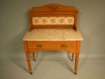 Nice english marble top washstand on rollers. Backsplash has 4 brown and white floral pattern 6" x 6" tiles. -h. 47" x w. 36 1/4" d. 18 1/4" Nice english marble top washstand on rollers. Backsplash has 4 brown and white floral pattern 6" x 6" tiles. -h. 47" x w. 36 1/4" d. 18 1/4"