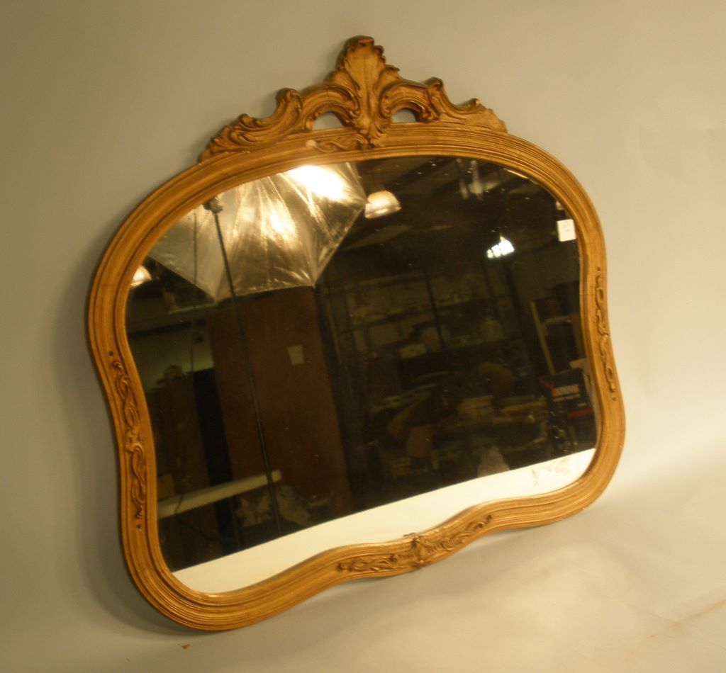 Nice gold framed wall mirror. Pretty scroll design at top. h. 25" x w. 28" Nice gold framed wall mirror. Pretty scroll design at top. h. 25" x w. 28"
