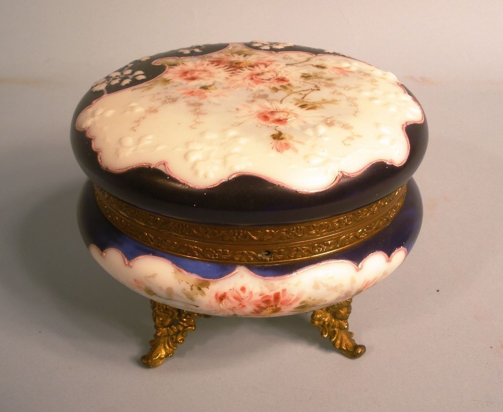 Large C. F. Monroe Gilt-Brass-Mounted Wave Crest Footed Glass Locked Jewel Box, fourth quarter 19th century, with cobalt blue ground and floral decoration, the base fully marked, h. 5", dia. 7". For a similar Wave Crest locked jewel box, see W. R. Cohen, Wave Crest, The Glass of C. F. Monroe, Collector Books, 1987, page 90. Large C. F. Monroe Gilt-Brass-Mounted Wave Crest Footed Glass Locked Jewel Box, fourth quarter 19th century, with cobalt blue ground and floral decoration, the base fully marked, h. 5", dia. 7". For a similar Wave Crest locked jewel box, see W. R. Cohen, Wave Crest, The Glass of C. F. Monroe, Collector Books, 1987, page 90.