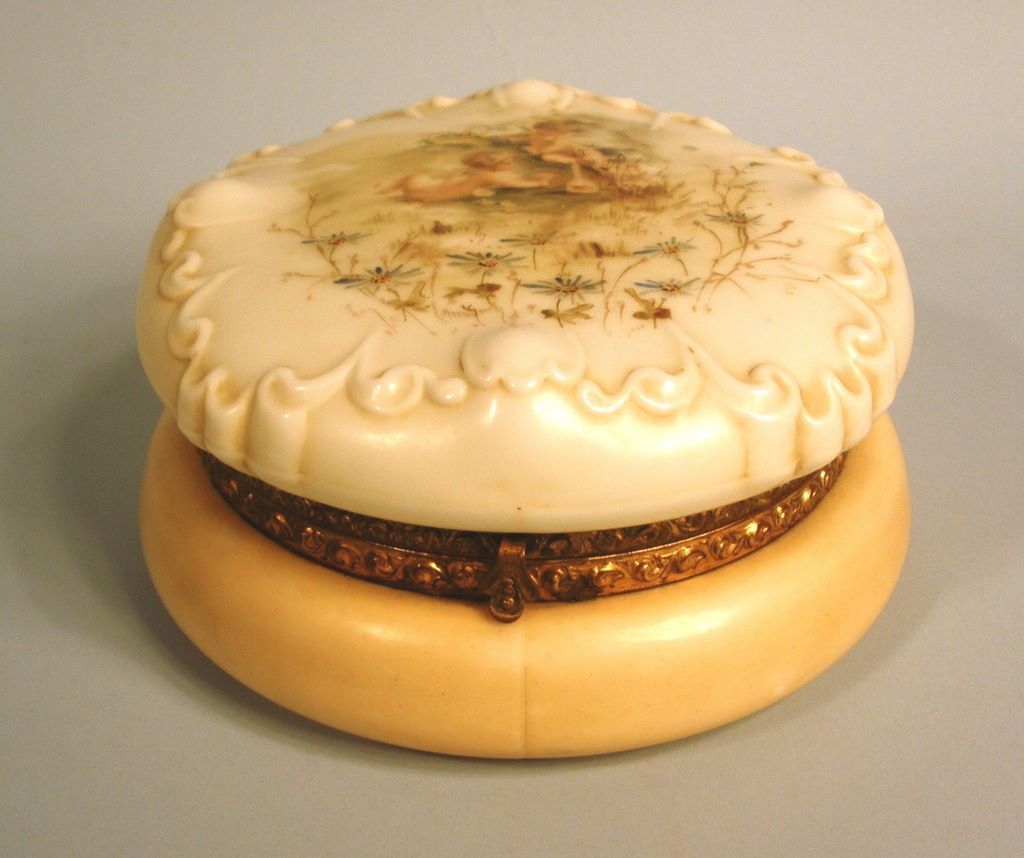 Large C. F. Monroe Gilt-Brass-Mounted Wave Crest Glass Circular Dresser Box, fourth quarter 19th century, in "Cherubim" d Large C. F. Monroe Gilt-Brass-Mounted Wave Crest Glass Circular Dresser Box, fourth quarter 19th century, in "Cherubim" d