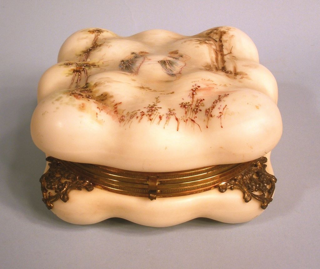 Good, Large C. F. Monroe Wave Crest Glass Puffy Square Dresser Box, fourth quarter 19th century, in "Dancing Classical Maidens" d Good, Large C. F. Monroe Wave Crest Glass Puffy Square Dresser Box, fourth quarter 19th century, in "Dancing Classical Maidens" d