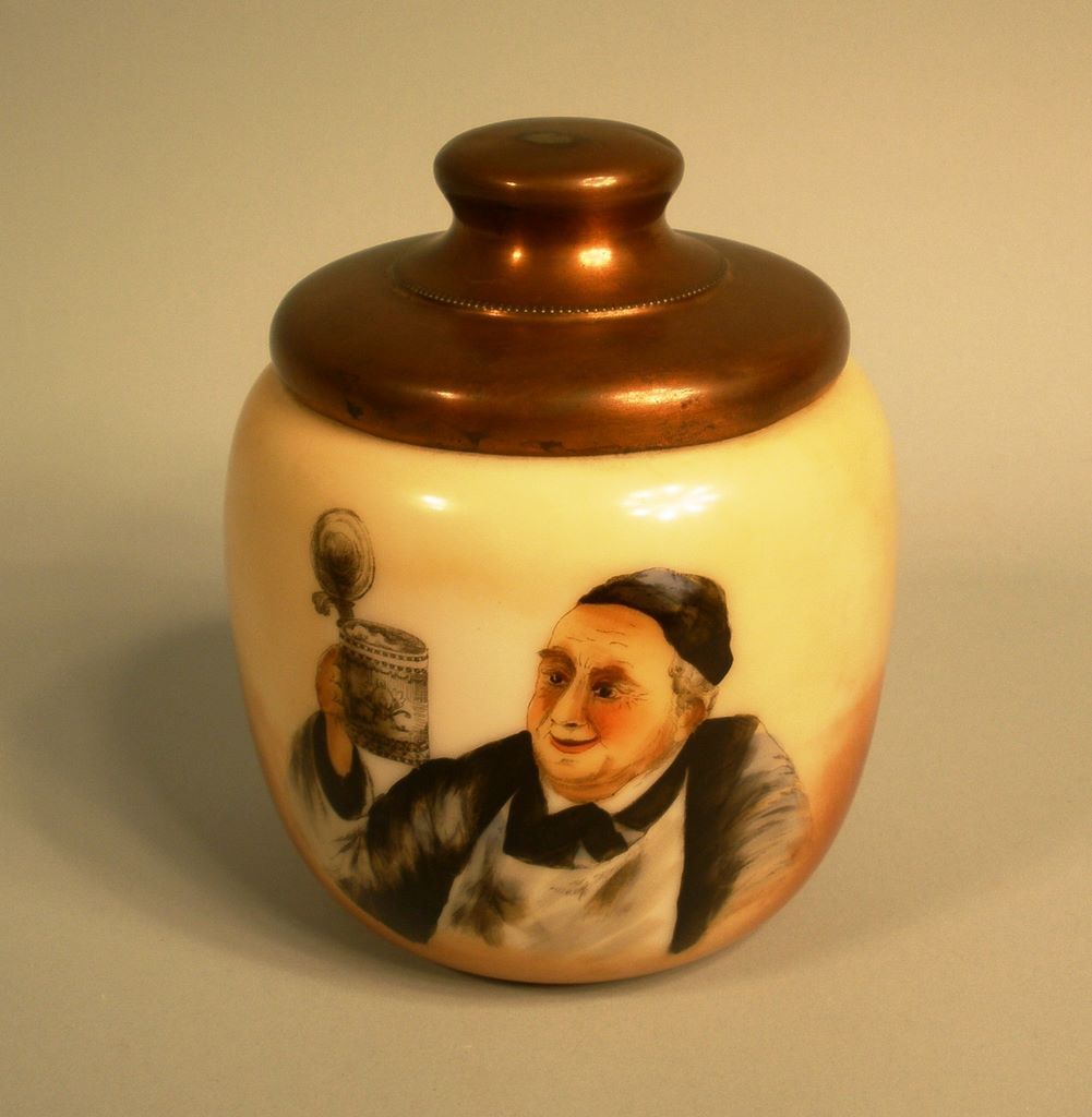 C. F. Monroe Company Wave Crest Glass Humidor, fourth quarter 19th century, in "Jolly Toper" d C. F. Monroe Company Wave Crest Glass Humidor, fourth quarter 19th century, in "Jolly Toper" d