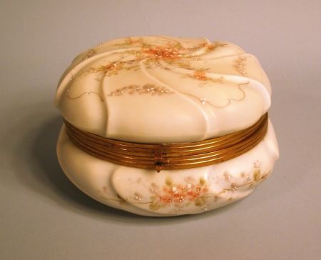 Good C. F. Monroe Gilt-Brass-Mounted Wave Crest Glass Dresser Box, fourth quarter 19th century, in "Helmschmied Swirl" decor, signed on the base in red, h. 4-1/4", w. 7". Good C. F. Monroe Gilt-Brass-Mounted Wave Crest Glass Dresser Box, fourth quarter 19th century, in "Helmschmied Swirl" decor, signed on the base in red, h. 4-1/4", w. 7".