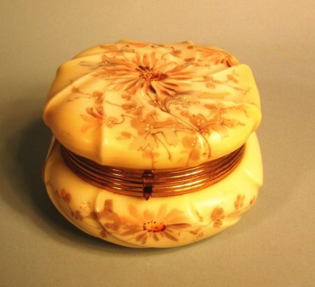 Rare C. F. Monroe Gilt-Brass-Mounted Wave Crest Opal Glass Box, fourth quarter 19th century, h. 3-1/2", w. 5-1/2". For a box of similar form, see W. R. Cohen, Wave Crest, The Glass of C. F. Monroe, Collector Books, 1987, p. 49, upper photograph, and p. 50, upper photograph. Rare C. F. Monroe Gilt-Brass-Mounted Wave Crest Opal Glass Box, fourth quarter 19th century, h. 3-1/2", w. 5-1/2". For a box of similar form, see W. R. Cohen, Wave Crest, The Glass of C. F. Monroe, Collector Books, 1987, p. 49, upper photograph, and p. 50, upper photograph.