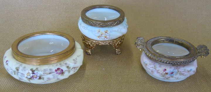 Group of Three Pieces of C. F. Monroe Wave Crest Glass, comprised of a gilt-brass-mounted and -footed circular jewel tray, a gilt-brass-mounted two-handled jewel tray and a larger gilt-brass-collared jewel tray, two examples signed in red, the other unmarked, h. 1-1/2" to 2-1/2", w. 3-1/2" to 4-1/2". For similar examples, see W. R. Cohen, Wave Crest, The Glass of C. F. Monroe, Collector Books, 1987, p. 107, top photograph, p. 108, top photograph, right, and p. 108, top photograph, second from the right. Group of Three Pieces of C. F. Monroe Wave Crest Glass, comprised of a gilt-brass-mounted and -footed circular jewel tray, a gilt-brass-mounted two-handled jewel tray and a larger gilt-brass-collared jewel tray, two examples signed in red, the other unmarked, h. 1-1/2" to 2-1/2", w. 3-1/2" to 4-1/2". For similar examples, see W. R. Cohen, Wave Crest, The Glass of C. F. Monroe, Collector Books, 1987, p. 107, top photograph, p. 108, top photograph, right, and p. 108, top photograph, second from the right.