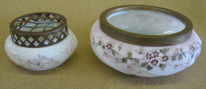 Two C. F. Monroe Glass Items, fourth quarter 19th century, one a brass-collared Wave Crest glass open "Swirl" jewel tray, unmarked, and the other a brass-mounted Wave Crest glass ash receiver, with the Wave Crest black stencil mark, h. 2-1/2", w. 3-1/2" and 6". For the form, see W. R. Cohen, Wave Crest, The Glass of C. F. Monroe, Collector Books, 1987, p. 107, and p. 108. Two C. F. Monroe Glass Items, fourth quarter 19th century, one a brass-collared Wave Crest glass open "Swirl" jewel tray, unmarked, and the other a brass-mounted Wave Crest glass ash receiver, with the Wave Crest black stencil mark, h. 2-1/2", w. 3-1/2" and 6". For the form, see W. R. Cohen, Wave Crest, The Glass of C. F. Monroe, Collector Books, 1987, p. 107, and p. 108.
