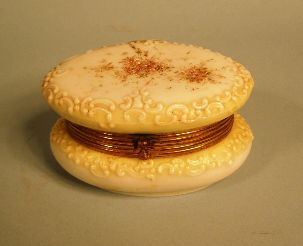 C. F. Monroe Gilt-Brass-Mounted Wave Crest Opal Glass Oval Jewel Casket, fourth quarter 19th century, in enameled "Blue Asters" d C. F. Monroe Gilt-Brass-Mounted Wave Crest Opal Glass Oval Jewel Casket, fourth quarter 19th century, in enameled "Blue Asters" d