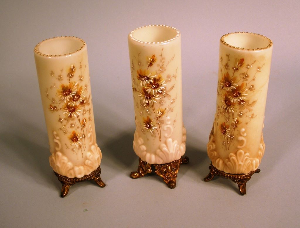606 Trio of Gilt-Brass-Mounted Wave Crest Opal Glass Cylindrical Footed Garniture Vases