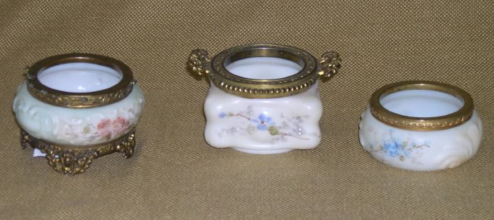 Trio of C. F. Monroe Gilt-Brass-Mounted Wave Crest Opal Glass Jewel Trays or Ash Receivers, fourth quarter 19th century, comprised of a square puffy example, a footed circular rococo example and a circular half-shell example, the footed and the half-shell examples signed, the footed example lacking its everted flat scrolled handles, h. 1-1/2" to 2-1/2", w. 3-1/4" to 4-1/4". Trio of C. F. Monroe Gilt-Brass-Mounted Wave Crest Opal Glass Jewel Trays or Ash Receivers, fourth quarter 19th century, comprised of a square puffy example, a footed circular rococo example and a circular half-shell example, the footed and the half-shell examples signed, the footed example lacking its everted flat scrolled handles, h. 1-1/2" to 2-1/2", w. 3-1/4" to 4-1/4".