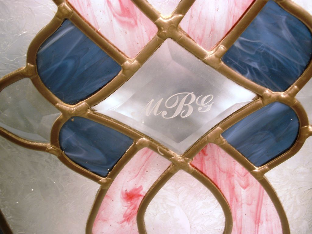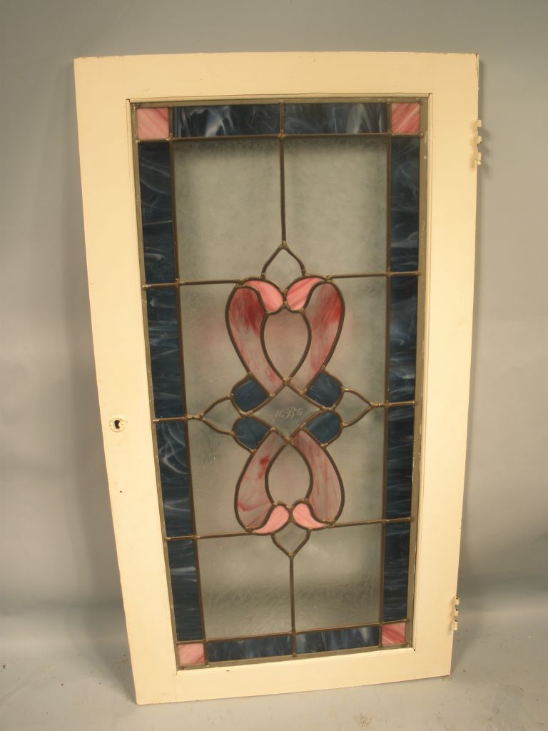 Beautiful old stain glass window with original hardware. Window was originally a flip out key lock window. Nice blue and pink colors. Window came out of Memphis Baking Company, h. 46" x w. 24" Beautiful old stain glass window with original hardware. Window was originally a flip out key lock window. Nice blue and pink colors. Window came out of Memphis Baking Company, h. 46" x w. 24"