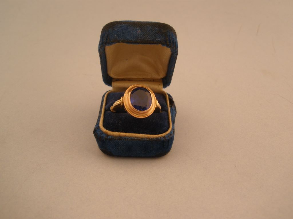 Beautiful Blue Sapphire gem oval in shape and pretty antique gold setting. In case. Beautiful Blue Sapphire gem oval in shape and pretty antique gold setting. In case.