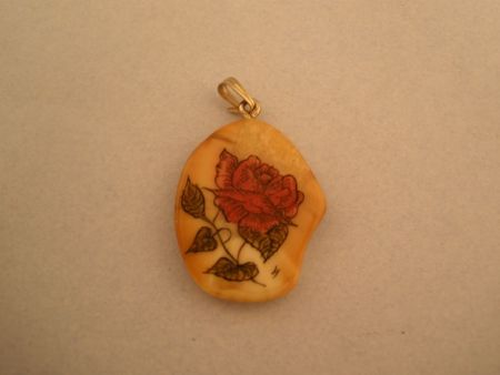 Small Pendant with hand painted rose design, appears to be Ivory, Walus Tusk. - h. 3/4" by w. 1/2" Small Pendant with hand painted rose design, appears to be Ivory, Walus Tusk. - h. 3/4" by w. 1/2"