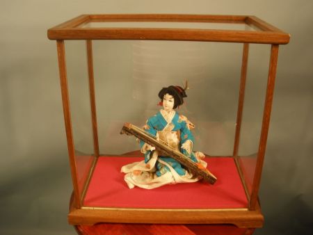 Seated Geisha Doll dressed in beautiful blue Kimono holding a long stringed musical instrument. Case is h. 20", w. 19.5". Seated Geisha Doll dressed in beautiful blue Kimono holding a long stringed musical instrument. Case is h. 20", w. 19.5".
