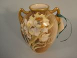 Double-handled Nippon vase. Brown tone background with floral design. H. 7" x w. 5" Double-handled Nippon vase. Brown tone background with floral design. H. 7" x w. 5"