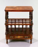 Edwardian Rosewood and Inlaid Canterbury, late 19th century, the top with a central inlaid medallion and string-lined border above an open section, the base partitioned with turned spindles and a drawer below, - h. 27" w. 22" d. 16" Edwardian Rosewood and Inlaid Canterbury, late 19th century, the top with a central inlaid medallion and string-lined border above an open section, the base partitioned with turned spindles and a drawer below, - h. 27" w. 22" d. 16"