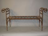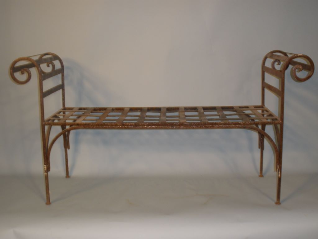 Nice open back iron garden bench with scroll design arms. H. 26" x l. 52" x w. 15" Nice open back iron garden bench with scroll design arms. H. 26" x l. 52" x w. 15"